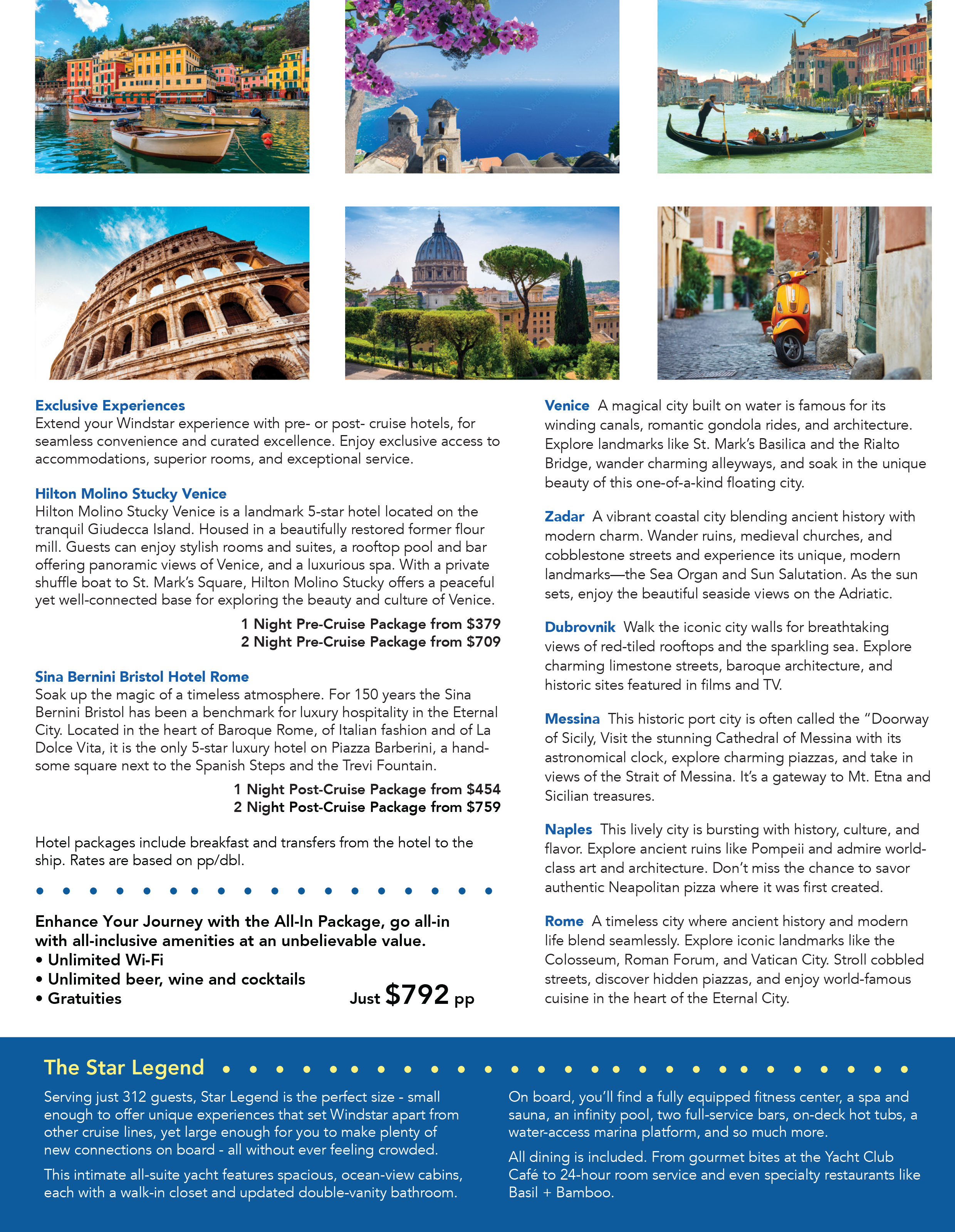 Join Gloria Bohan, esteemed Godmother of Star Legend, on an unforgettable voyage beginning in the romantic city of Venice and ailing along Italy and the breathtaking Adriatic coast.