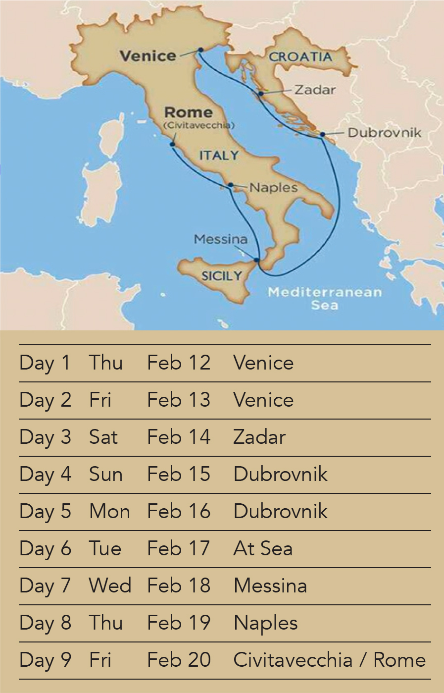 coast visiting ports including Zadar, Dubrovnik, Messina, and Naples before concluding in Rome. Explore iconic landmarks such as the Sistine Chapel, St. Mark’s Square, and the ruins of Pompeii.
