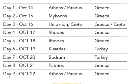 Join Gloria Bohan, Godmother of Star Legend, as you savor the enticing islands and historic wonders of Greece and Turkey on this round trip voyage from Athens.